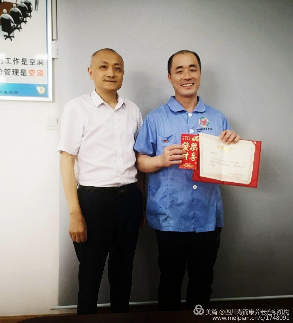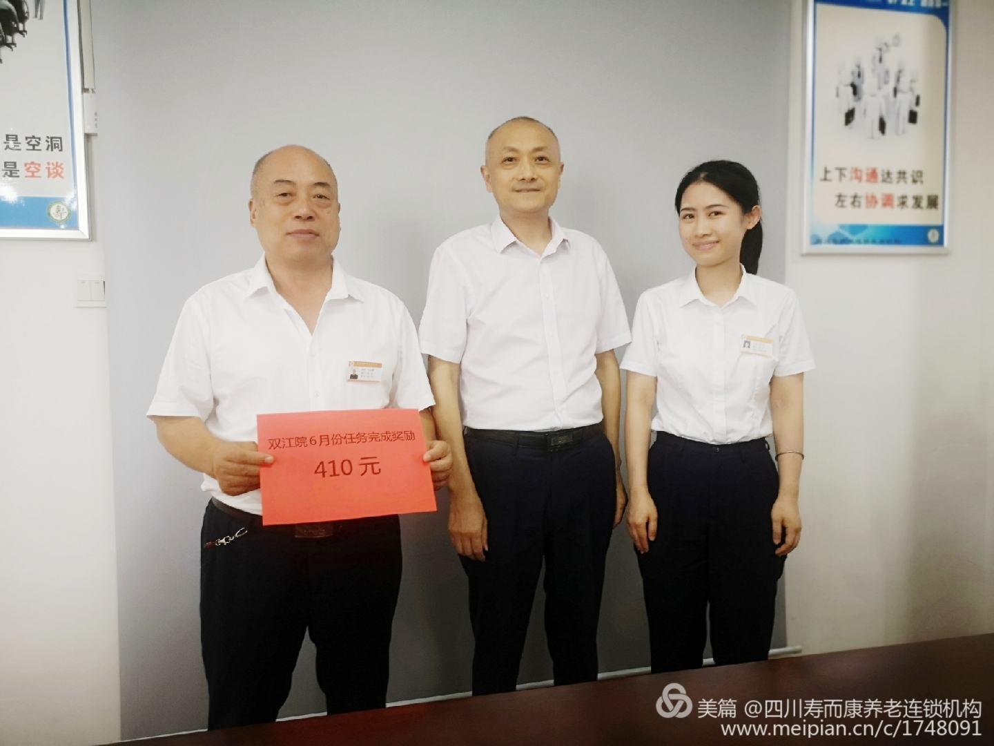 董事長(cháng)親自為6月份銷(xiāo)售冠軍團隊一一四川宜賓壽而康鳳凰湖養老院頒獎。